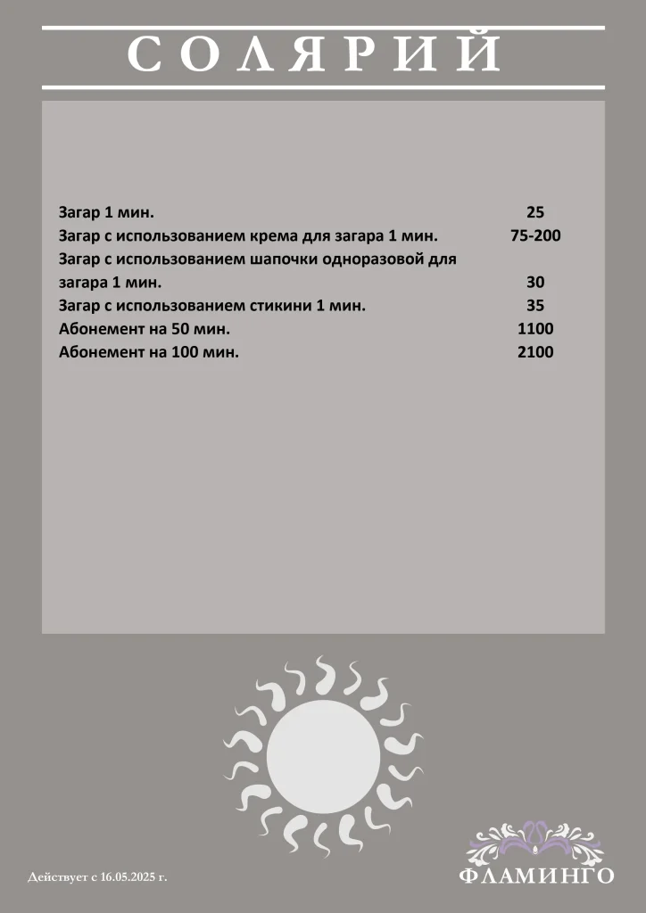 Солярий парикмахерской Фламинго – это удобное помещение со всем необходимым инвентарем, обработкой после каждого клиента и сильные лампы вертикального солярия и самые доступные цены для Вашего шоколадного загара. Кроме того, прямо в парикмахерской Вы можете приобрести специализированные крема для загара, стикини и шапочки для защиты волос. Если Вы не нашли интересующую Вас услугу в прайсе, пожалуйста, позвоните по тел. 559-101.