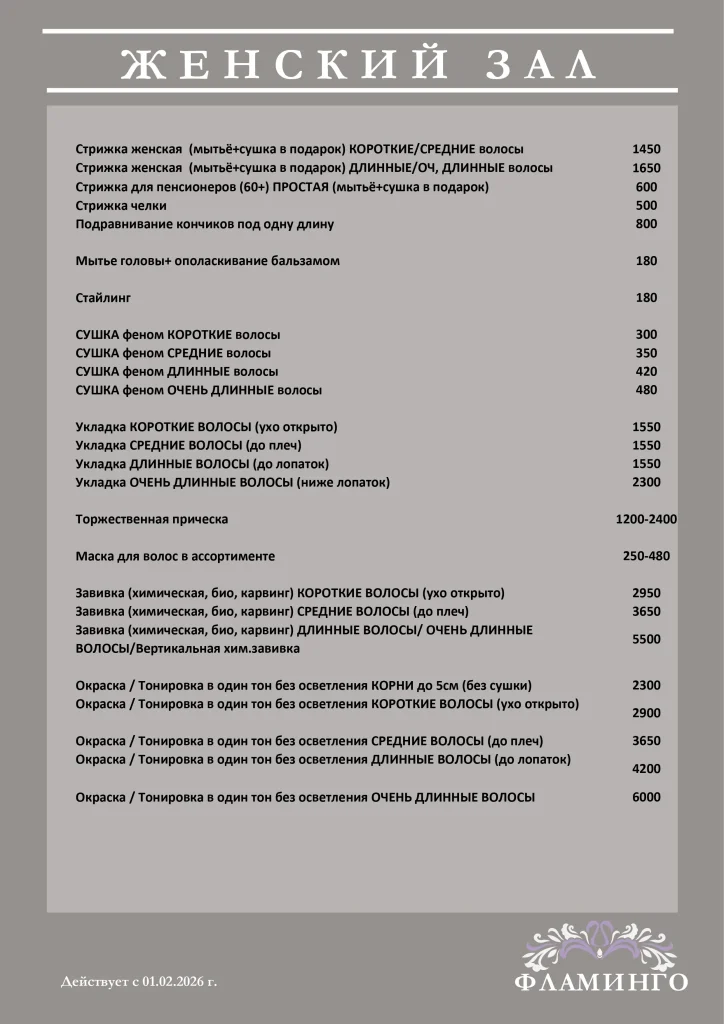 Женский зал парикмахерской Фламинго предлагает большой перечень услуг, таких как стрижка, окрашивание, мелирование, химическая и биозавивка, и другие, а также комплекс процедур по уходу за волосами, таких как термокератин, экранирование, укрепляющие и восстанавливающие маски и многое другое.